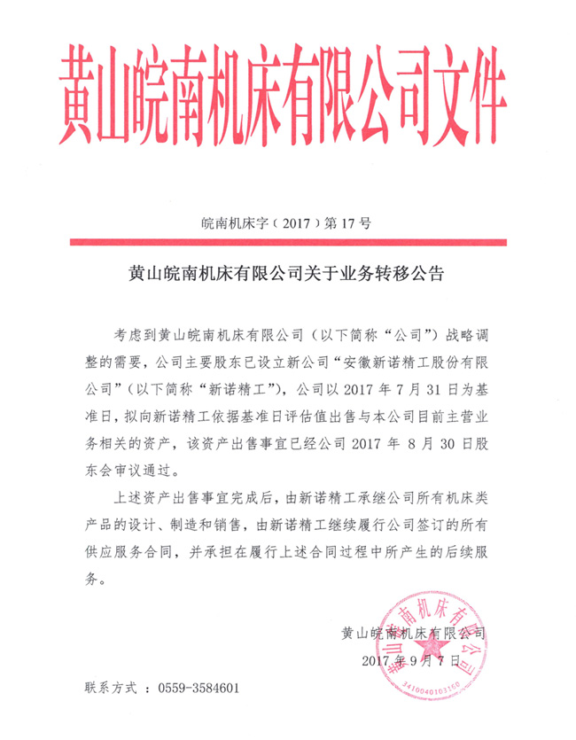 考慮到黃山皖南機(jī)床有限公司(以下簡(jiǎn)稱“公司”)戰(zhàn)略調(diào)整的需要,公司主要股東已設(shè)立新公司“安徽新諾精工股份有限公司”(以下簡(jiǎn)稱“新諾精工”),公司以2017年7月31日為基準(zhǔn)日,擬向新諾精工依據(jù)基準(zhǔn)日評(píng)估值出售與本公司目前主營(yíng)業(yè)務(wù)相關(guān)的資產(chǎn),該資產(chǎn)出售事宜已經(jīng)公司2017年8月30日股東會(huì)審議通過(guò)。