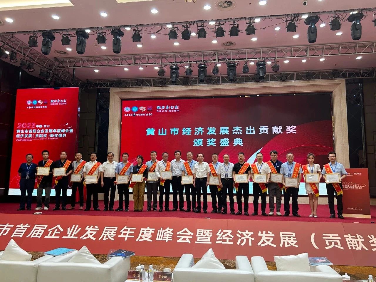 2023年8月29日,黃山市首屆企業(yè)發(fā)展年度峰會暨經(jīng)濟發(fā)展貢獻獎頒獎盛典在屯溪隆重舉行。市人大常委會副主任、一級巡視員陸群,副市長王恒來,市政協(xié)副主席胡黎明,安徽省企業(yè)家聯(lián)合會會長鄔國慶等出席。本次活動由黃山市企業(yè)(企業(yè)家)聯(lián)合會、黃山市發(fā)展促進會主辦,浙江浙企云科技有限公司、黃山交通旅游廣播承辦。
